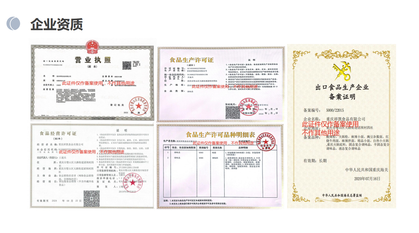 公司先后通過ISO三體系認(rèn)證,知識產(chǎn)權(quán)認(rèn)證,兩化融合A級認(rèn)證,有系統(tǒng)的多層次員工培訓(xùn)體系。2019年成為“示范食品生產(chǎn)企業(yè)”,2020-2023年被授予“區(qū)級農(nóng)業(yè)產(chǎn)業(yè)化龍頭企業(yè)”,2022年獲得高新技術(shù)企業(yè)(證書編號GR202251101662),是重慶江湖菜發(fā)展促進(jìn)會理事單位,重慶火鍋產(chǎn)業(yè)集團(tuán)副會長單位,也是重慶輕工職業(yè)學(xué)院共建單位,重慶食品工業(yè)研究所合作單位。